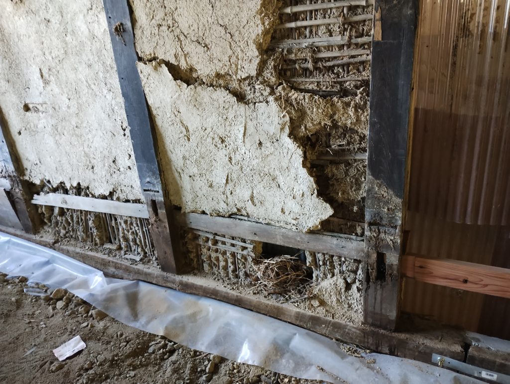 写真の右側に杉の板が横に並んで張られているのが見えますが、これは土壁を壊して改修したモルタル壁ですね。