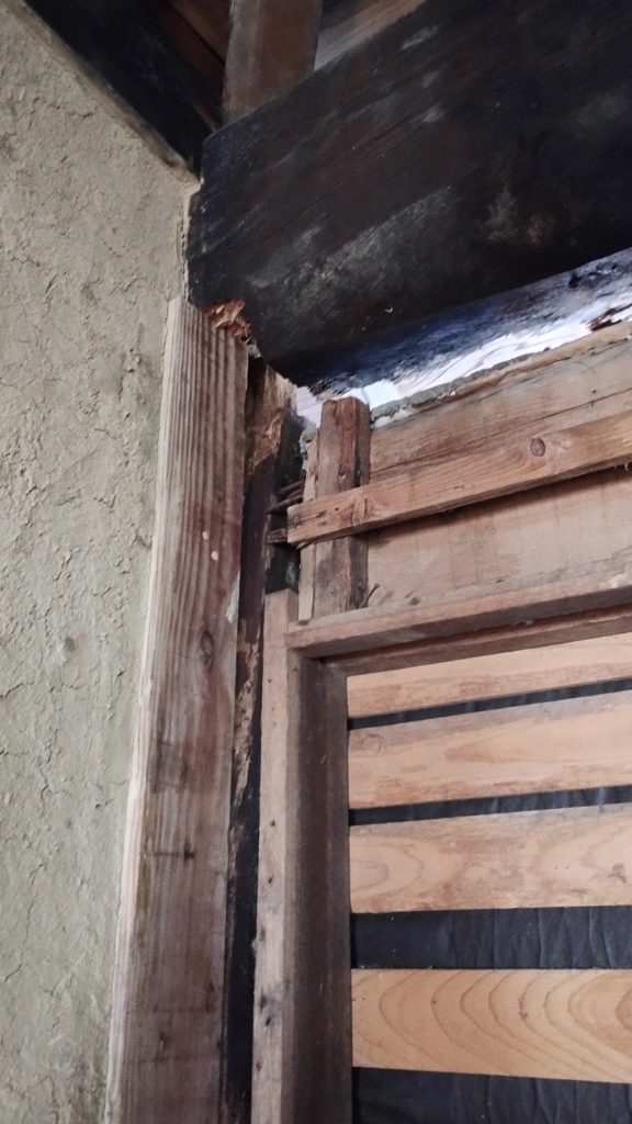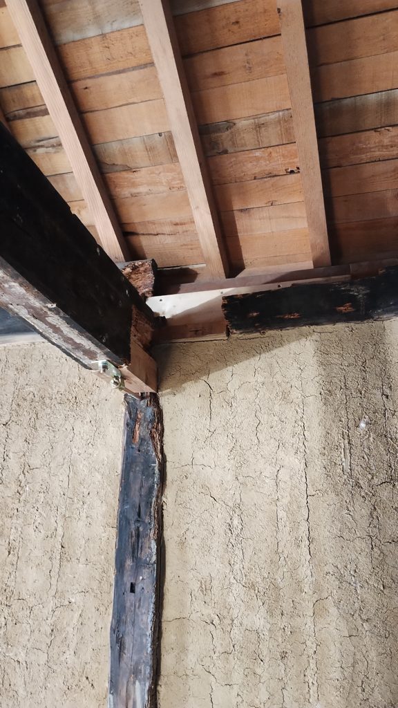 一番右の壁の上にある梁は中までやられていて、柱が突き抜けていました。他の壁が支えていたのですが、よく耐えてたな。。新たな柱を横に立ててボルトで縫って補強。